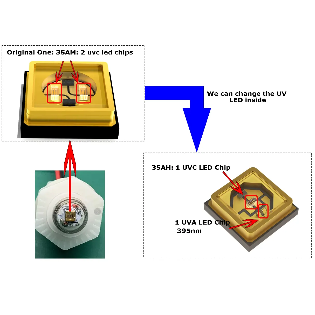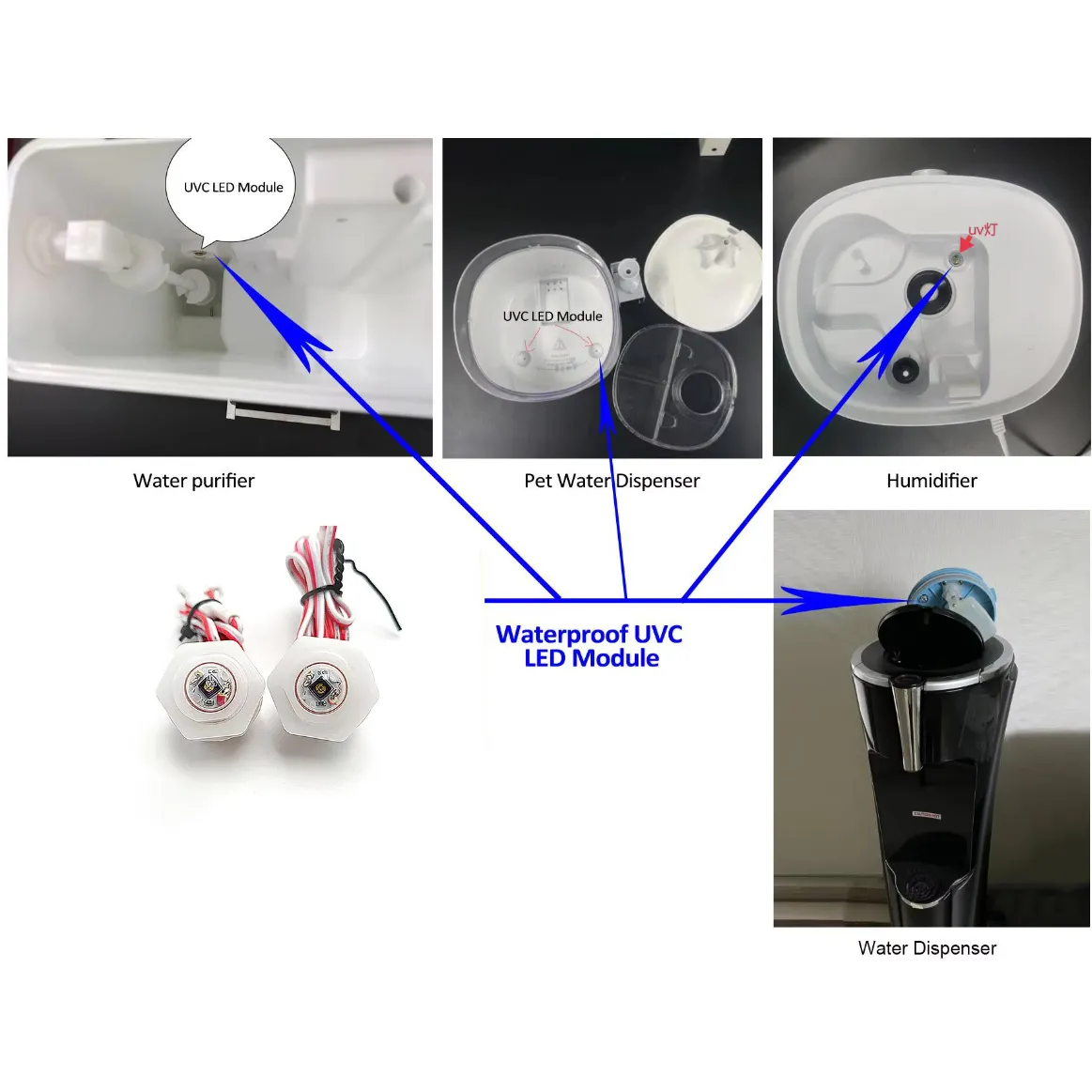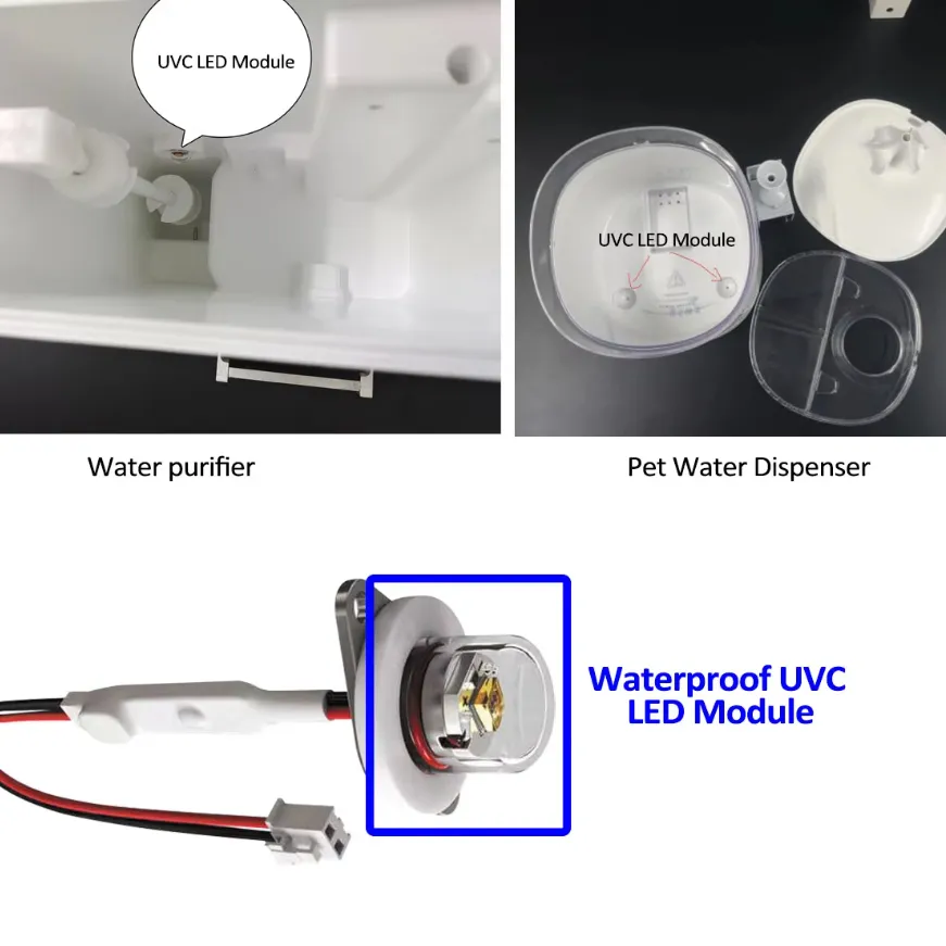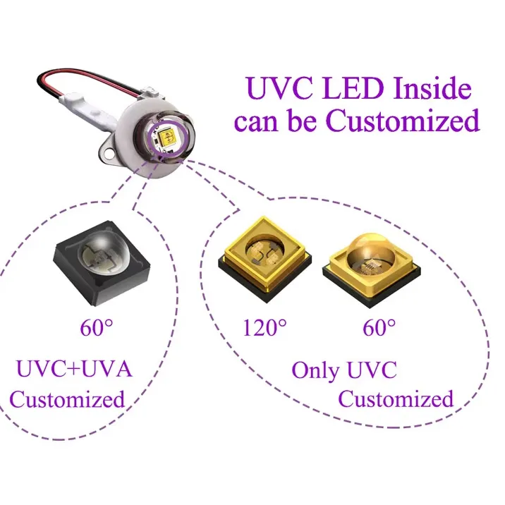 This UVC LED module is designed for water disinfection in tanks up to 10L, featuring a peak wavelength of 260-270nm and an output radiant power of 4-6mW. It ensures a 99.9% sterilization rate and is waterproof, making it ideal for humidifiers, pet water dispensers, and water purifiers. The module undergoes rigorous testing, including waterproof, aging, and bactericidal tests using E. coli, ensuring strong stability and quality assurance.